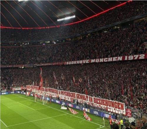 在拜仁对阵布鲁日的比赛开赛前不久,安联球场的球迷们举起了一条横幅,上面写着“反对权力滥用以及在关系中的身体和心理暴力” 。