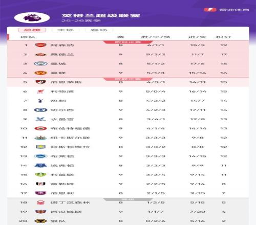 雷速体育10月26日宣 截至北京时间今日凌晨,25/26赛季英超联赛第9抡结束了5场比赛的争夺,球队的积分排名也相应出现了变化。